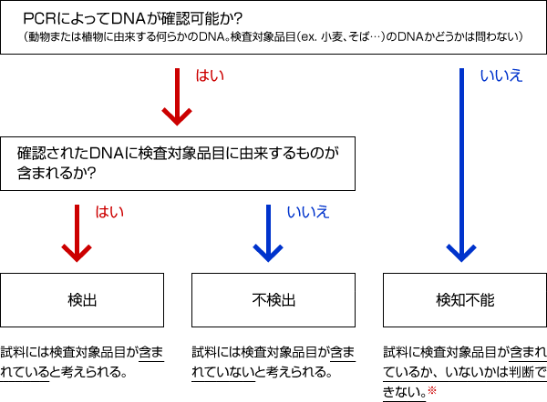 「検出」とは試料に検査対象品目(ex. 小麦、そば…)が含まれること、「不検出」とは試料に検査対象品目が含まれないこと、「検知不能」とはどちらとも判断できないこと、を意味します。実際の検査では以下のように判定します。なお、「検知不能」となった場合、DNA抽出方法を変更することで結果が変わる可能性があります。